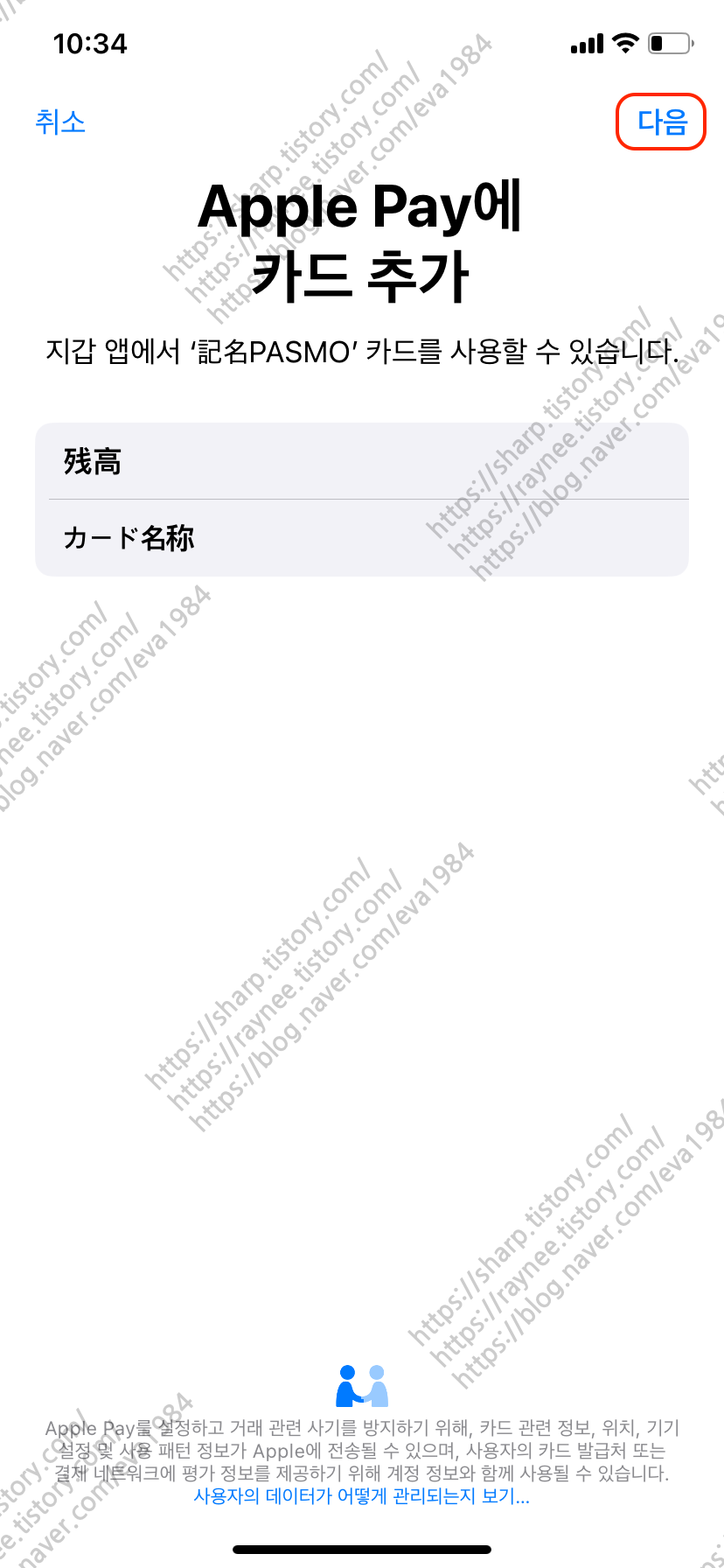 애플페이에 추가할 수 있는 화면이 나오고 다음을 눌러줍니다.