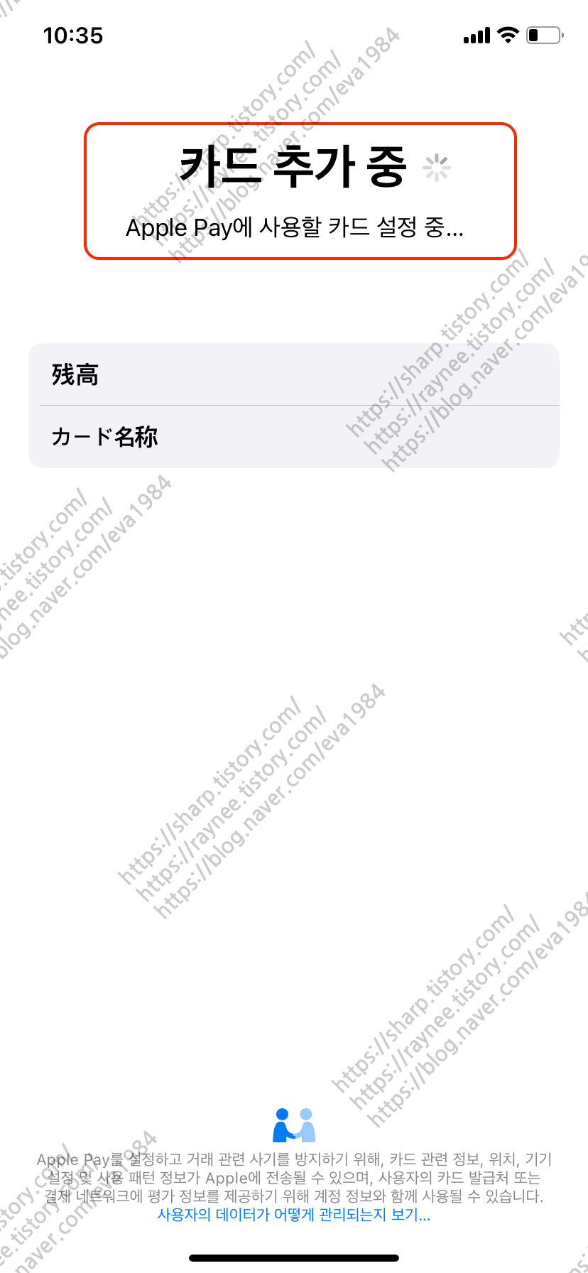두둥~~ 카드 추가 중이라고 나옵니다.